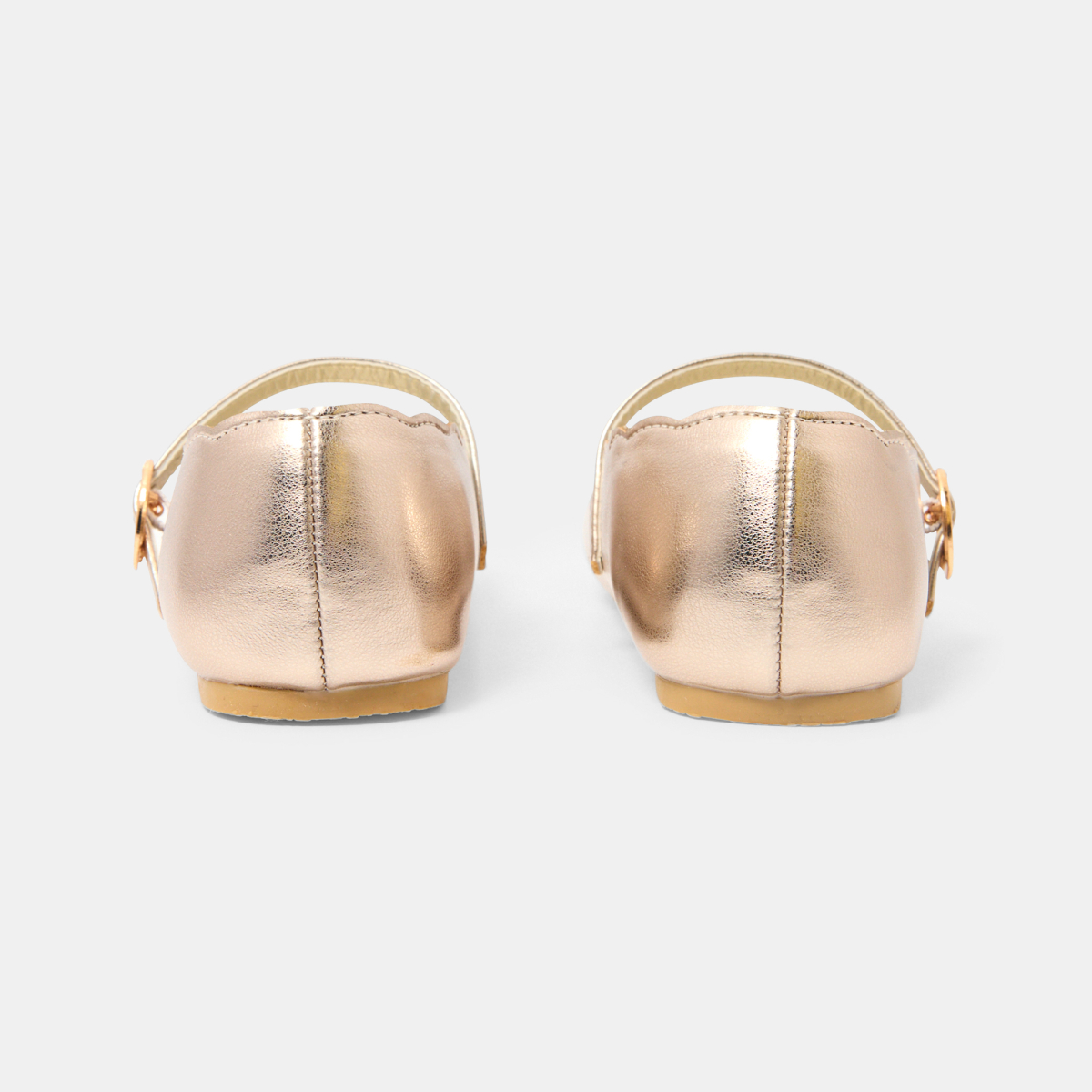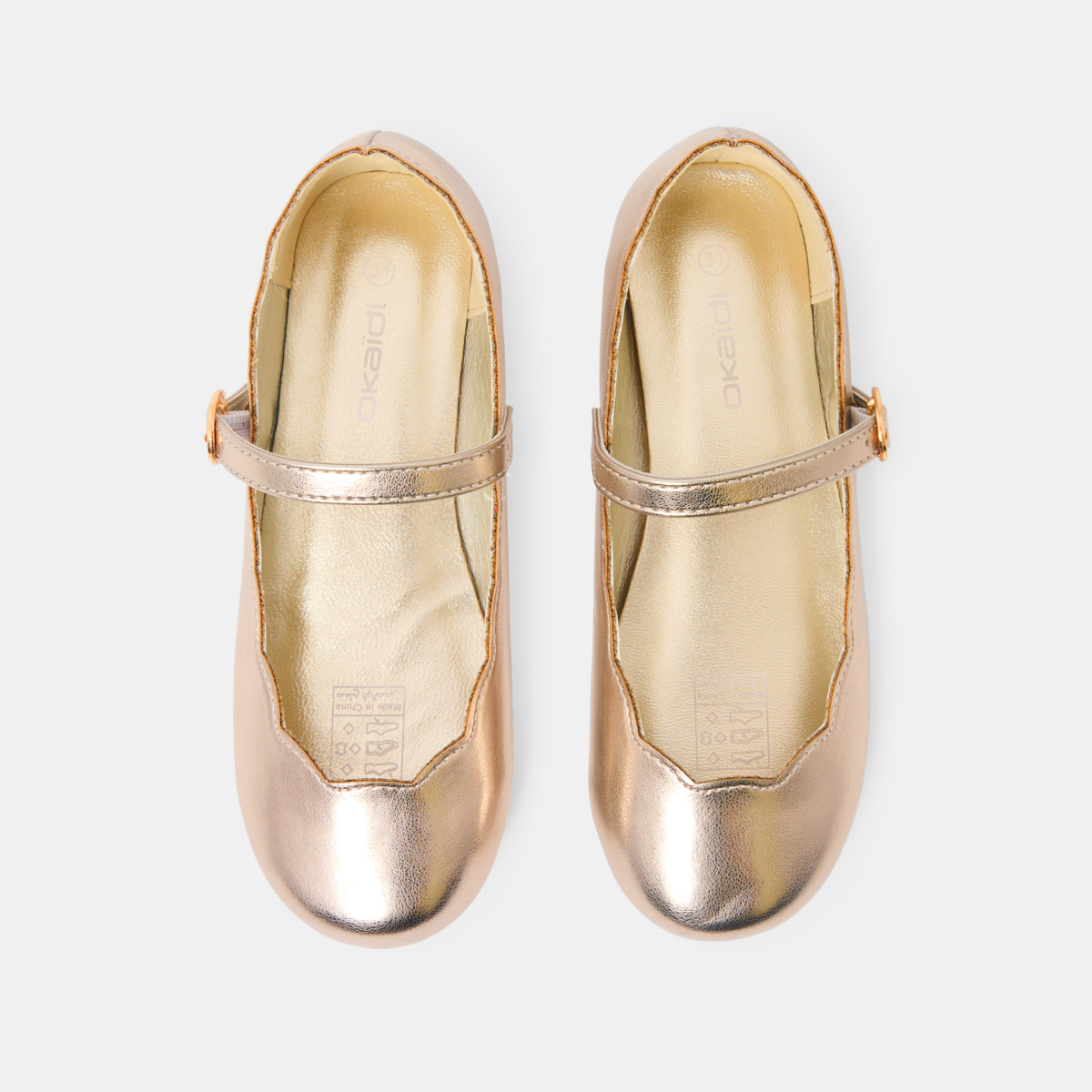 This elegant ballerina flat with a strap for girls has a scalloped edge and metallic finish. A stylish shoe with a leather insole for comfort. Also available in Obaïbi sizes for formal events.