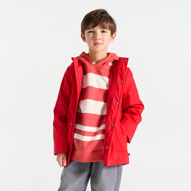 We can't wait for the rain the wind and the fresh air! With this hooded raincoat it's a pleasure to enjoy the changing weather. Soft water-repellent fabric. Lined with striped sailor jersey. Straight cut. Hood lined in jersey. Concealed zip fastening with press-stud placket. Long sleeves ribbed cuffs. 2 press-stud pockets. Hanging loop and name tag inside.