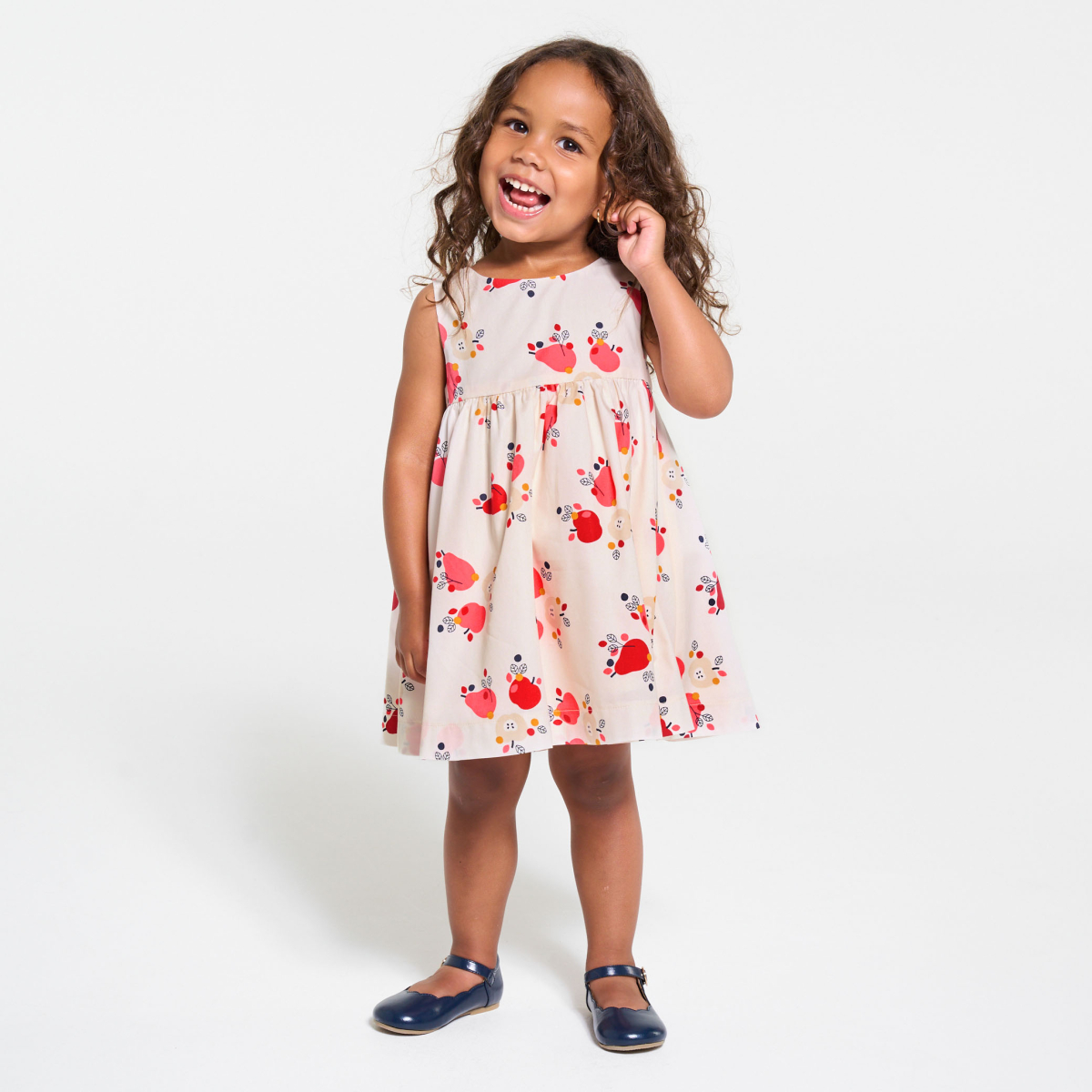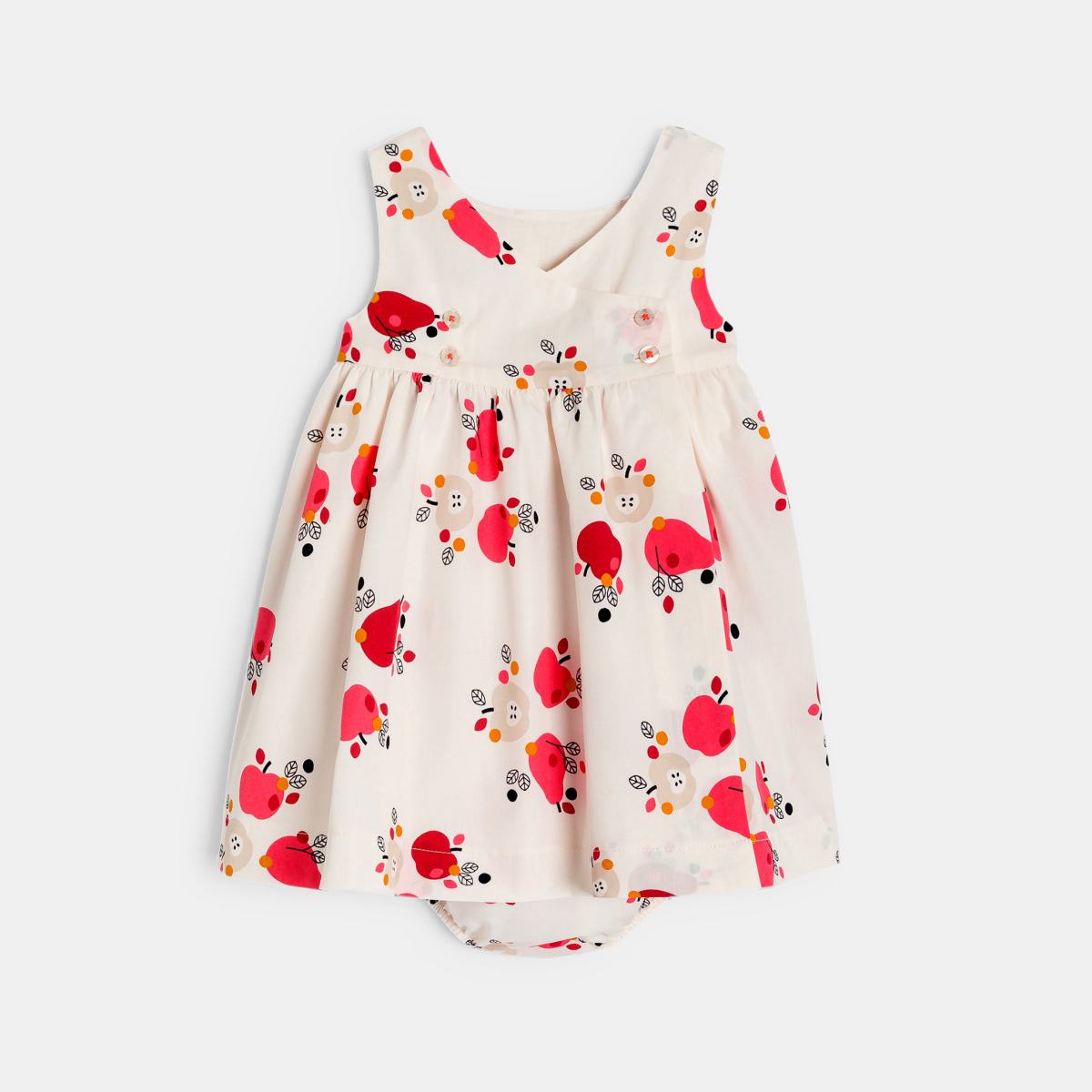 For special days and events this is a lightly embossed lined formal dress. Graphic-style print and little straps. Button cross-over fastening on the back. Bloomers with matching elasticated waist and thighs. Bloomers included from 3 months to 23 months.