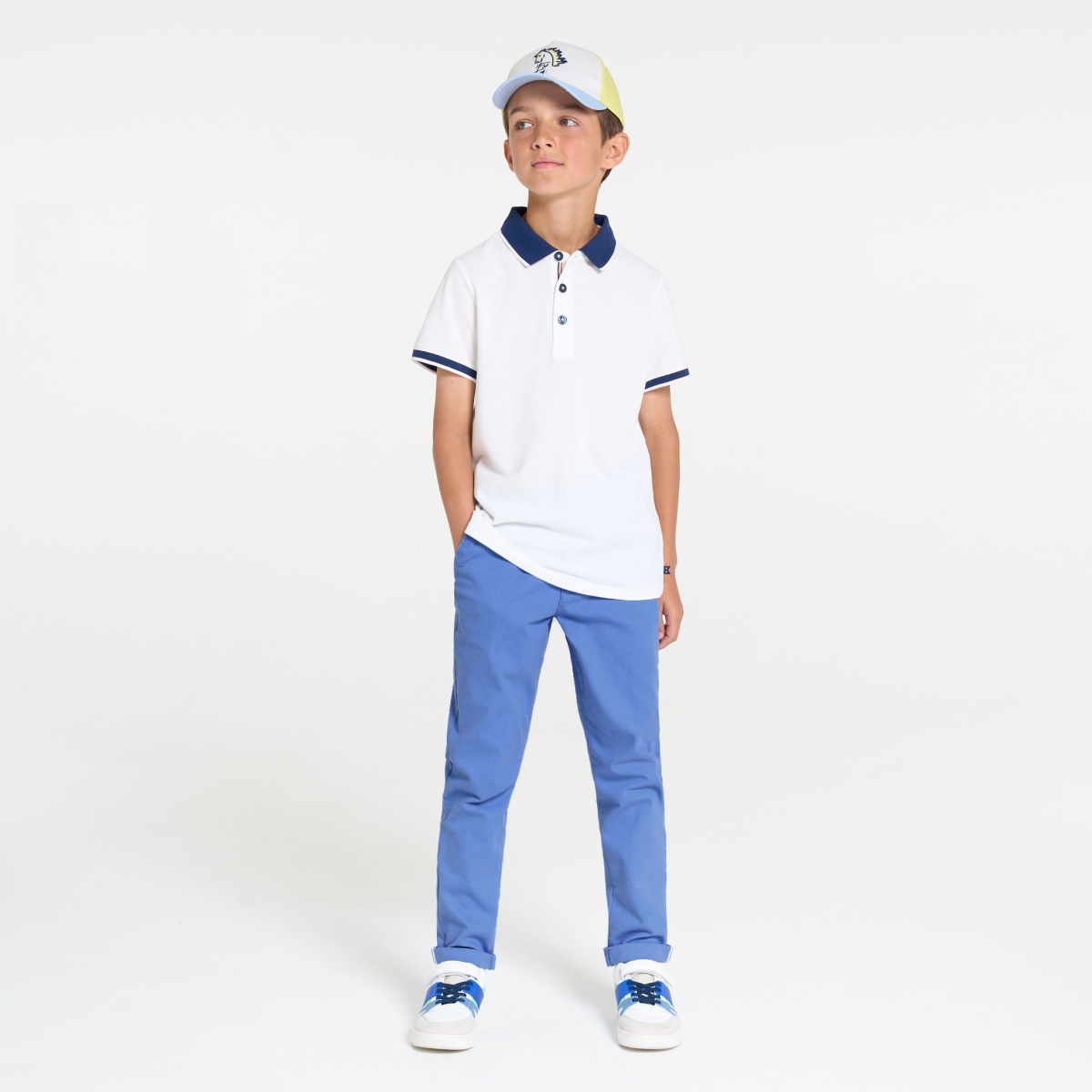 Descriptive Chinos are always a good option for a cool and/or chic boy's look. Easy to match. Slim fit. Soft fabric. Belt loops. Adjustable waist. Adjustable and removable canvas web belt. 2 pockets. Adjustable turn-ups. Piqué finish.