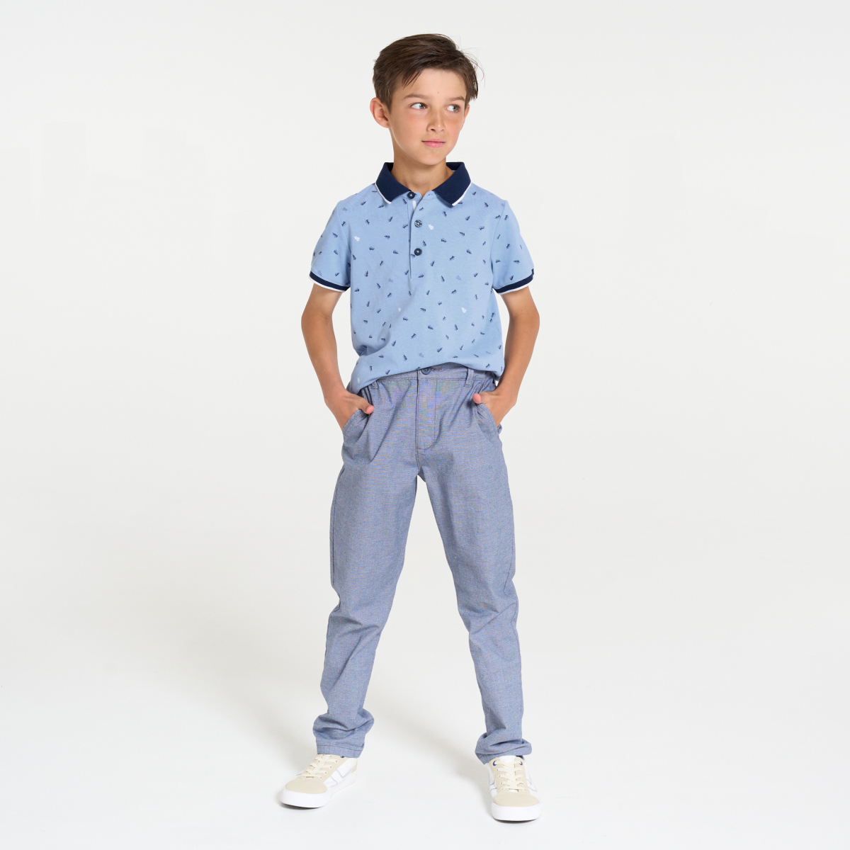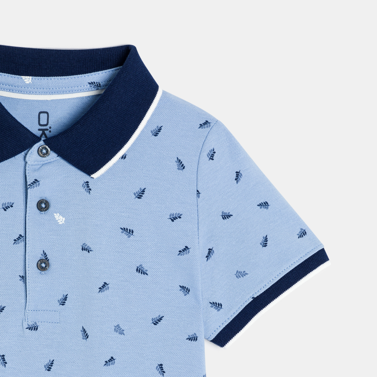 Boy's blue jersey piqué printed polo shirt with short sleeves