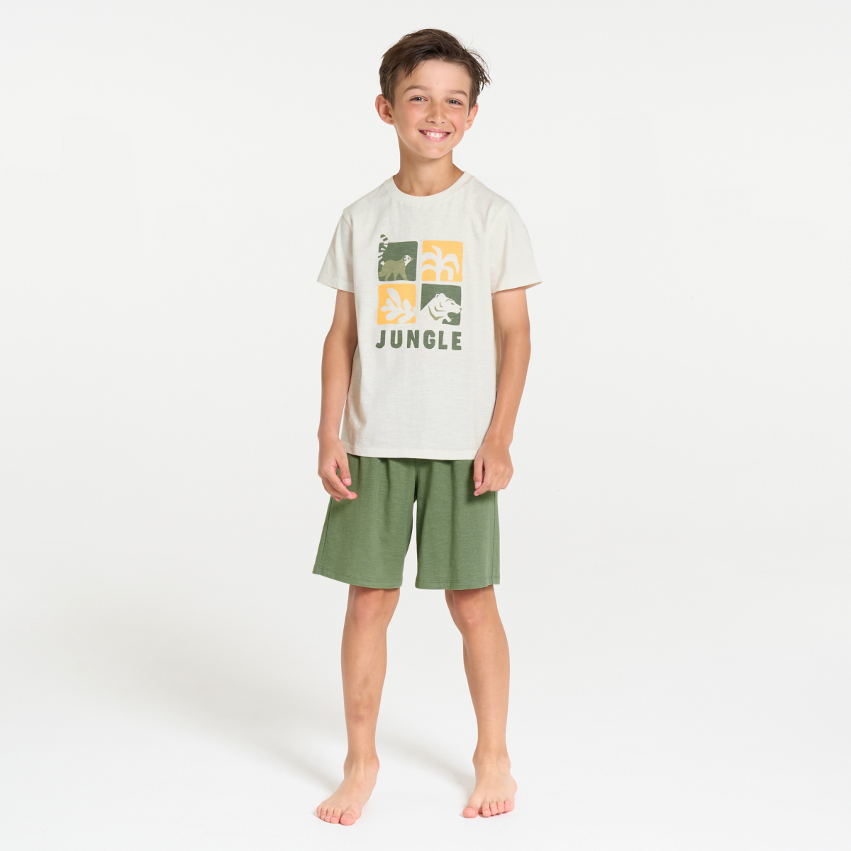 One thing's for sure, this season, boys will love adventures, even at night! These jersey pyjamas comprise two items: a T-shirt with a motif on the front (straight cut, crew neck, short sleeves) and plain shorts (elasticated waist).