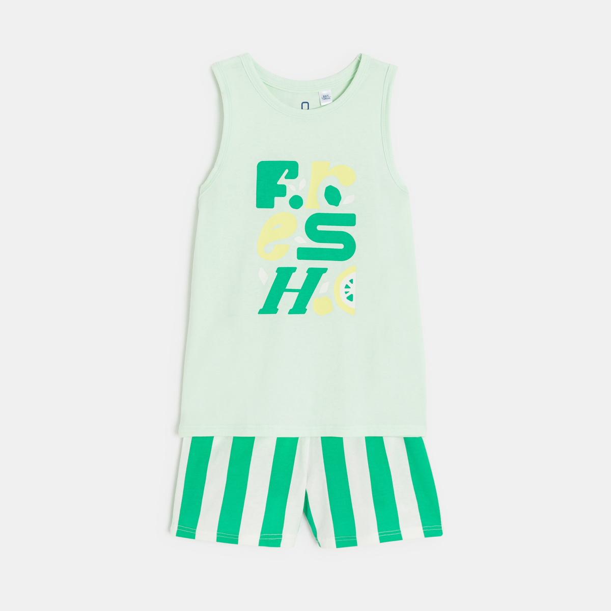 Descriptive Vibrant and light: these jersey pyjamas are perfect for summer nights, crisp mornings and to help boys make the most of the summer! These pyjamas comprise two coordinating items: a sleeveless T-shirt with a motif on the front (straight cut, crew neck, plain back) and striped shorts (elasticated waist).