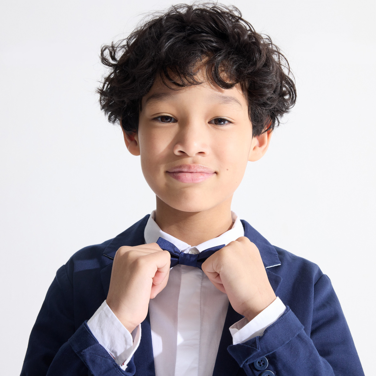 A chic classic in a boy's wardrobe the white shirt is adorned with a bow tie for those festive days! Cotton poplin. Straight cut. Classic shirt collar. Hidden button opening under placket. Long sleeves to roll up under button placket buttoned cuffs. Inside piping detail. Slightly rounded base.