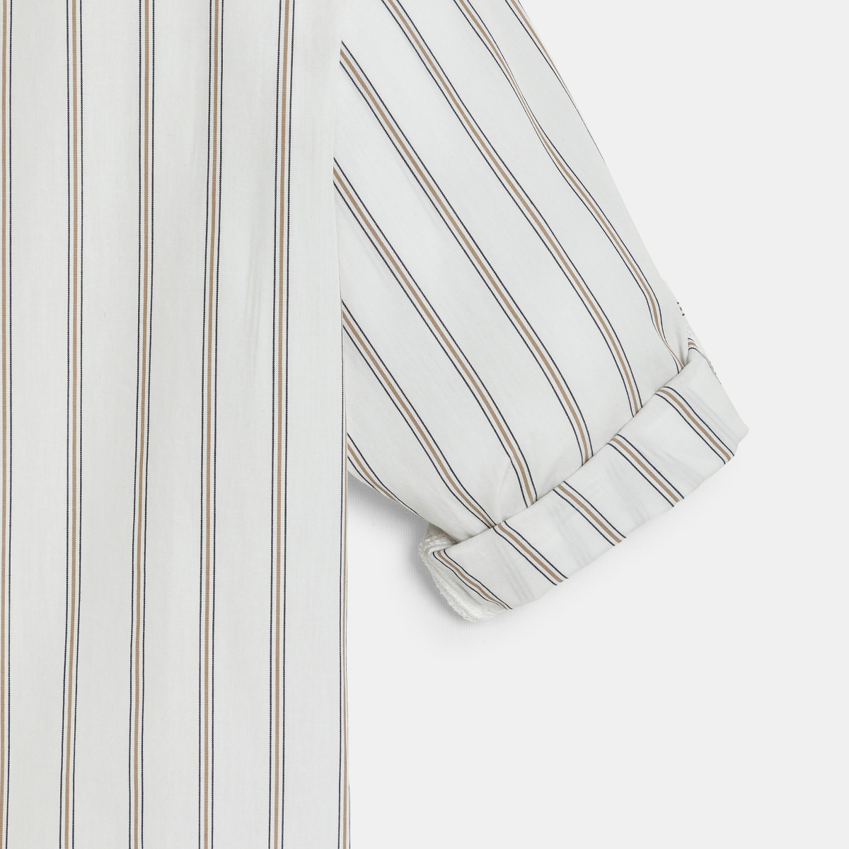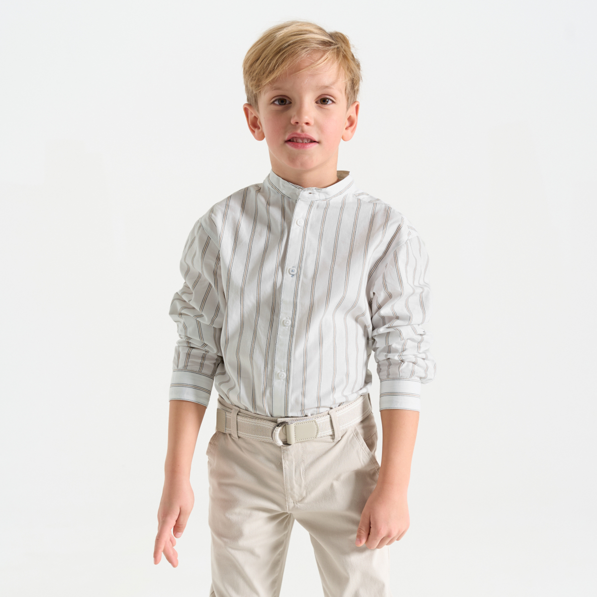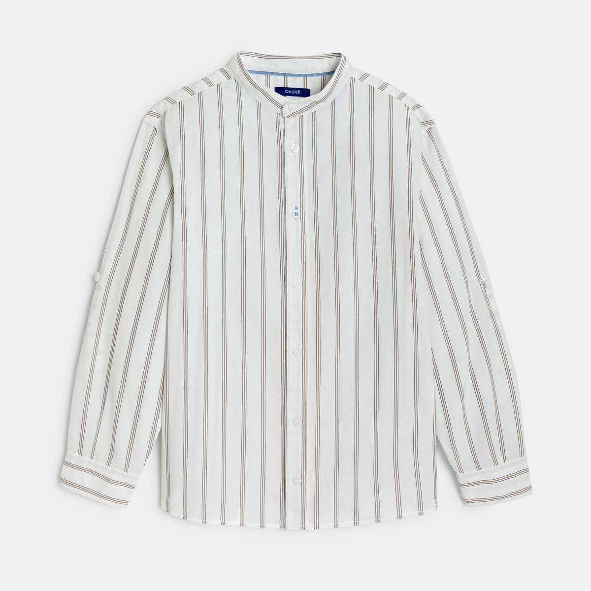 The simplicity of a striped shirt is always a good idea for boys' looks. The Mandarin collar keeps things cool. Cotton poplin is comfortable to wear. Straight cut. Long roll-up sleeves with buttoned tab. Buttoned cuffs. Rounded hemline.