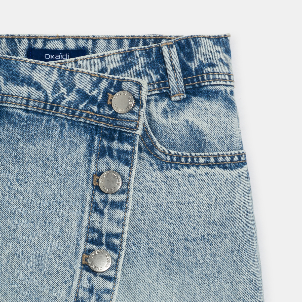 Descriptive It looks like a mini-skirt but it's really comfy super-practical shorts for playing running and doing all the things all summer long! Faded denim. A-line cut. Belt loops. Front button fastening. Elasticated waist adjustable with buttons. Top-stitched finish.