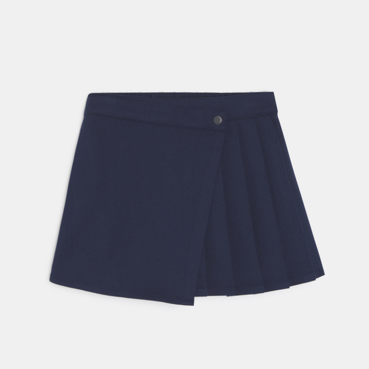 Descriptive Chic and cheeky. Girls can cultivate a new retro style with this short preppy college-style skort. Flared cut. Wrap around front. Button fastening. Elasticated waist at the back. Rounded hemline.