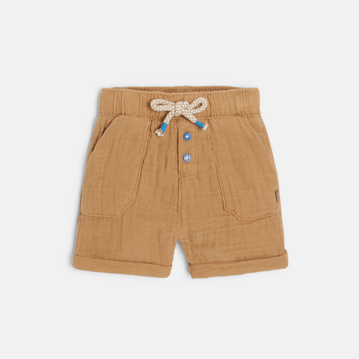 Total freedom of movement for boys with these embossed cotton gauze shorts. Very comfortable with its elastic waist adjustable by button and its fancy tie.