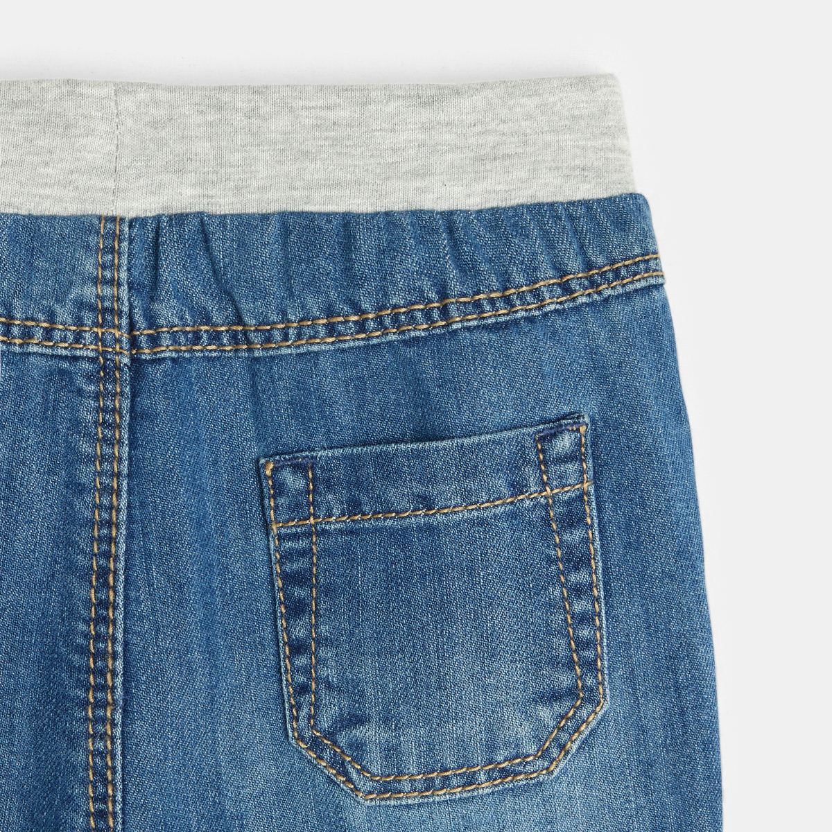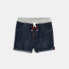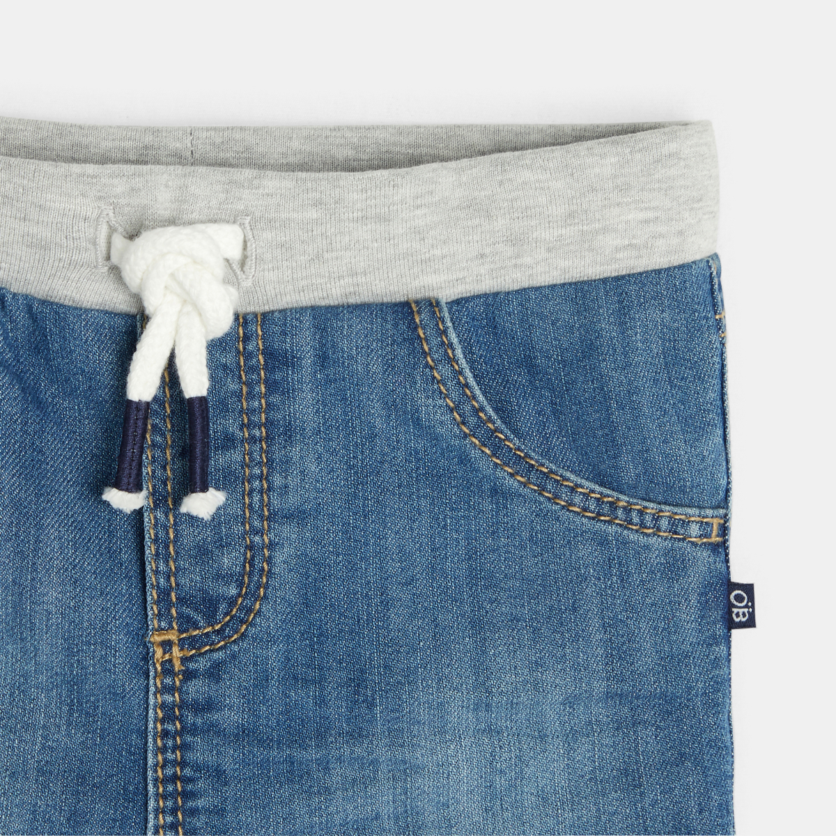 Denim shorts for baby boys. Denim made withAct for Kids organic cotton fibers. 4 pockets. Adjustable elasticated waistband with comfortable rib trimming and elastic bands insidewith a knotted lace. Loose turn-ups on the leg bottoms. Contrasting topstitching. Obaïbi label.