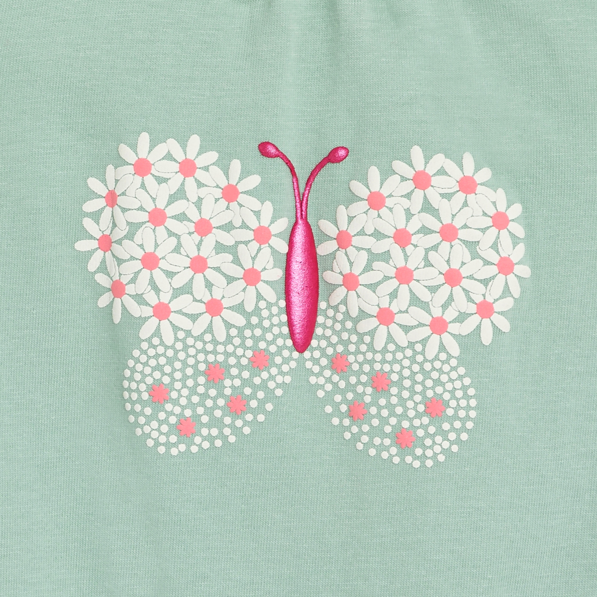 Flowers or butterflies? Girls don't have to choose with this short jumpsuit! They'll spend their days surrounded by comfort in this romper, it's ideal for moving around freely.in warmer weather. Short ruffle sleeves, elasticated thighs. Press-studs fasten on the back for easy dressing.
