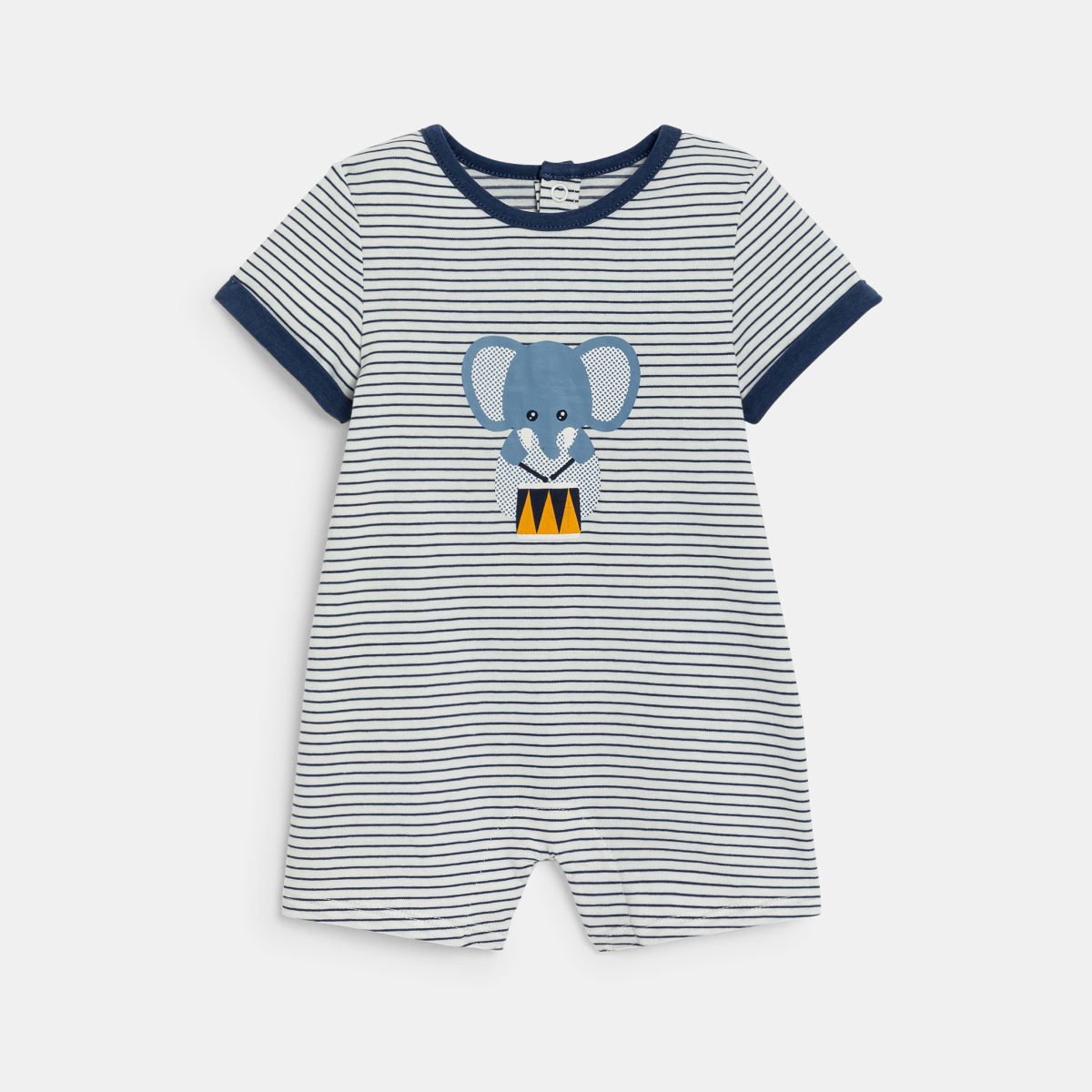 Descriptive Let the music flow with the elephant! For warm nights or hot days this short romper is a comfortable choice for boys. Fastens at the back.