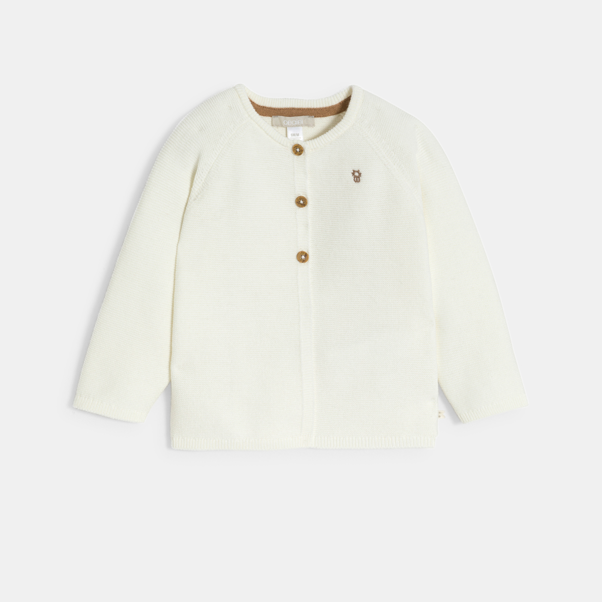 The softness of the knit fabric keeps little ones warm from birth. Comfortable and easy to put on this cardigan is a must-have in your maternity bag. We love the moss stitch and soft colour a wardrobe essential for boys and girls. Button fastening.