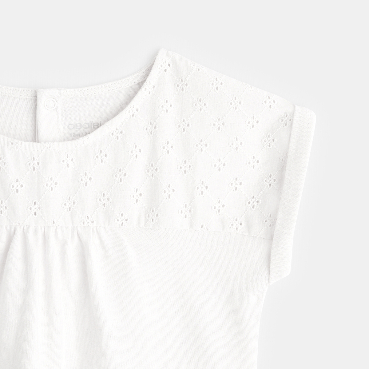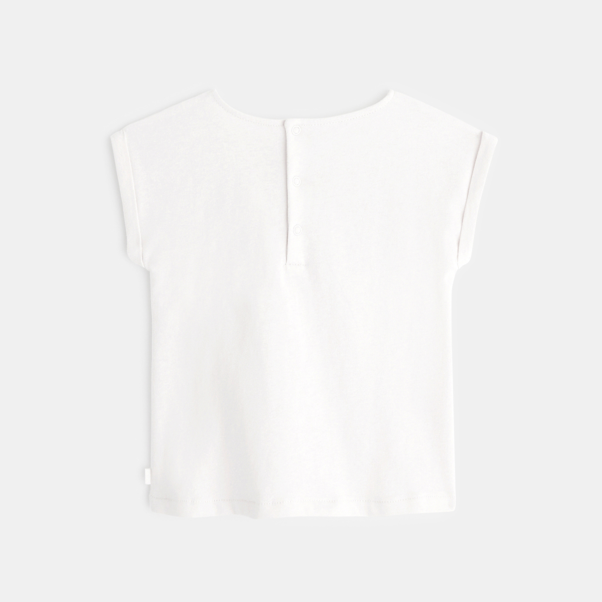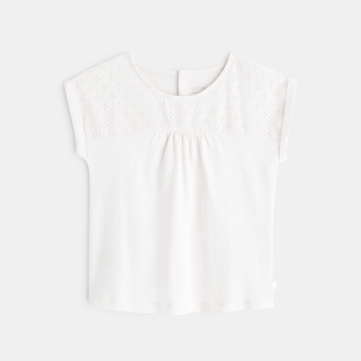 Delicate and romantic embroidery invites itself on this jersey T-shirt. Plays of pleats and cuffs on the short sleeves like so many details that little girls like.