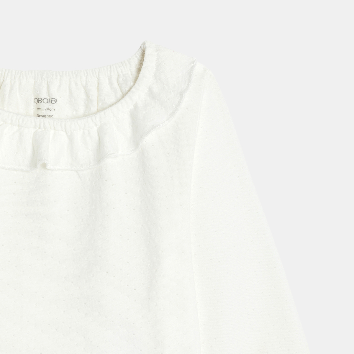 A must-have in every little girl's wardrobe, the long-sleeved T-shirt can be worn with a skirt or trousers. Made from fancy cotton with a pointelle effect, it adds an original touch to girls' outfits with its ruffled collar. Comfortable, slightly flared base.