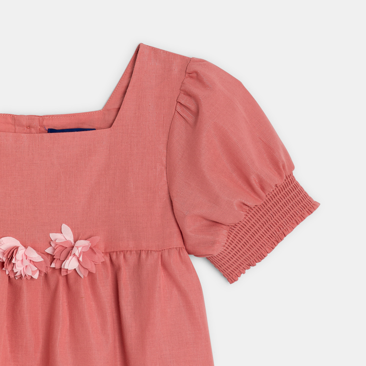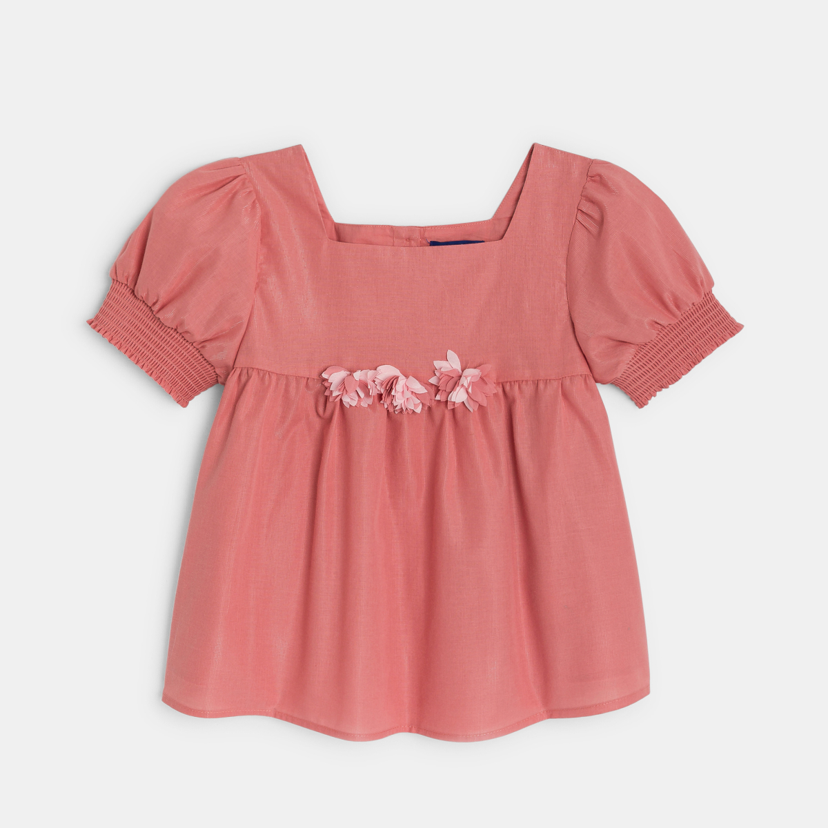 It's so cute! Small fabric flowers personalise this slightly shiny fabric blouse. We also like the square collar (front and back) and the fitted princess sleeves. Flared cut. Ruffled inserts. Button fastening on the back, easy to slip on. Tone-on-tone piqué finish.