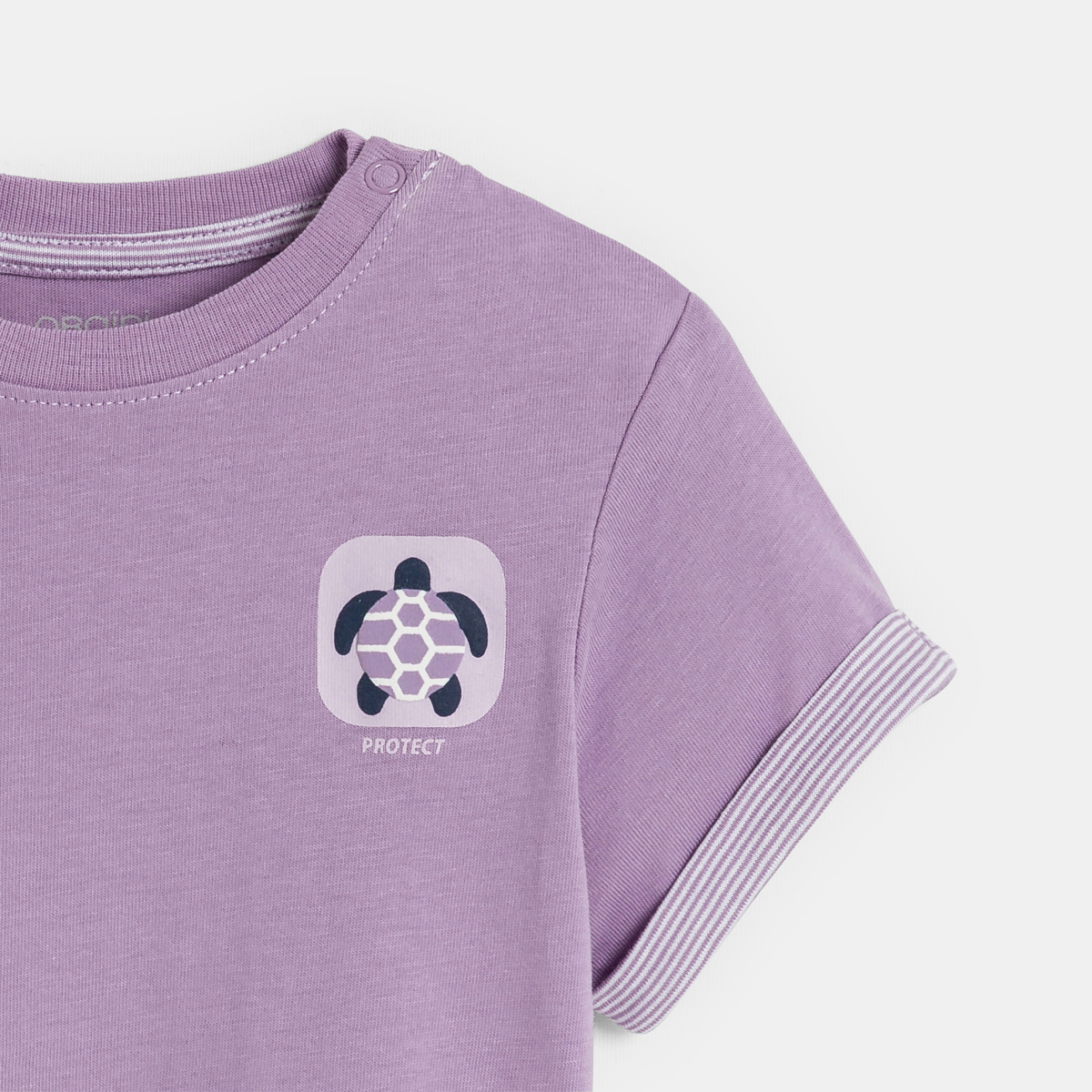 Baby boy's short-sleeve T-shirt. Jersey fabric in fibres from organically grown cotton, Act for Kids. Printed and rubber pattern on chest in different colours Crew neck with ribbed finish, press-stud on shoulder to slip the garment easily over the head. Short sleeves with piqué striped cuffs. Little Obaïbi label detail.