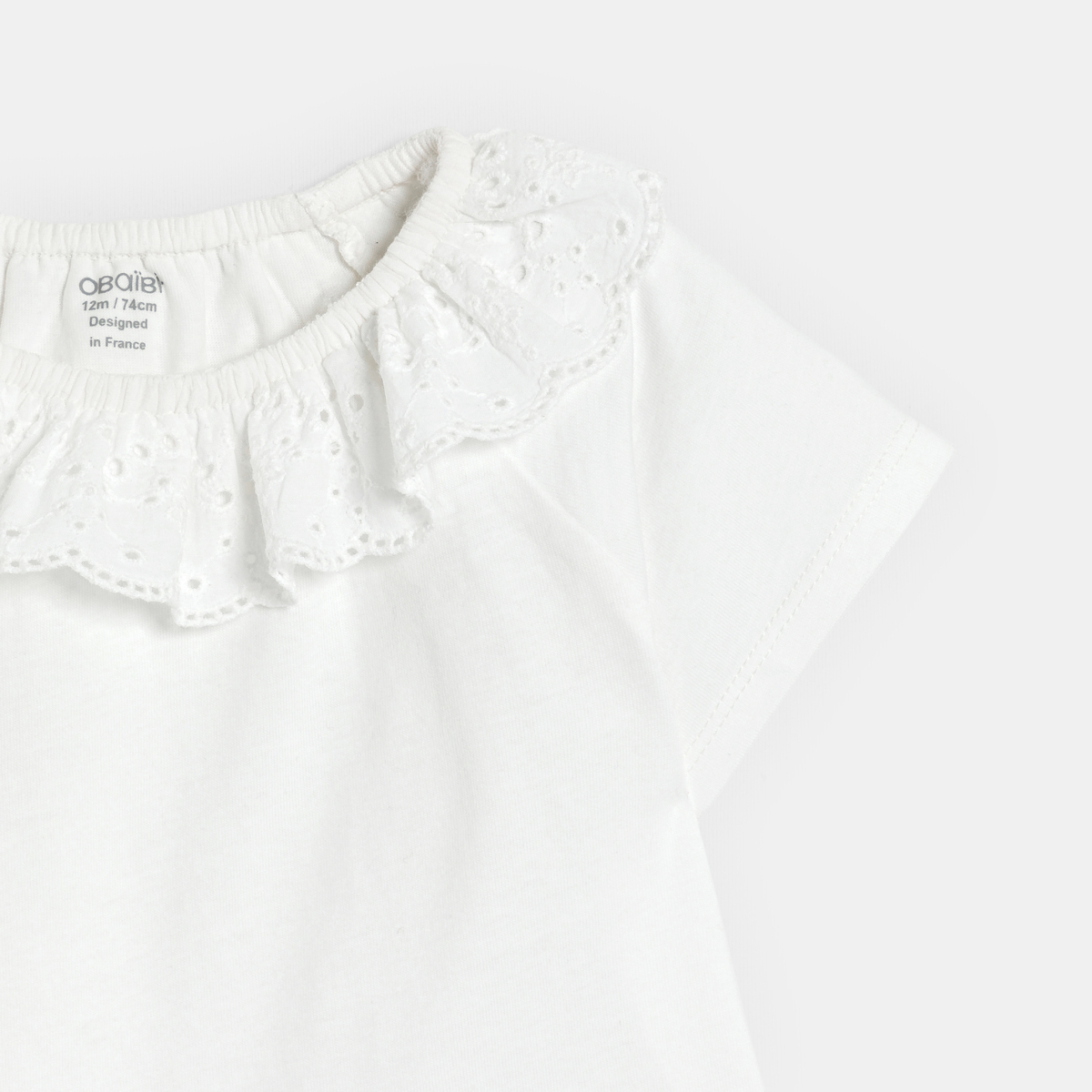 With this T-shirt with its embroidered collar, girls can add a touch of English style to their wardrobe. Wide elasticated collar for easy dressing for little ones on a slightly flared cotton base.
