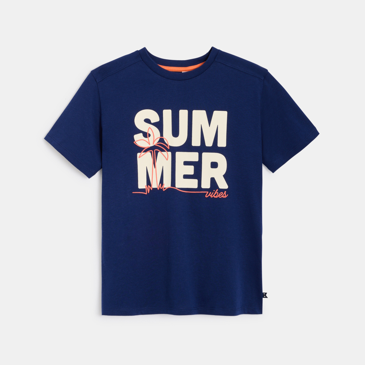 Descriptive A message to get across, and a desire to make the most of the warm weather: boys will want this T-shirt in a range of colours! Soft jersey. Straight cut. Ribbed crew neck, easy to slip on. Motif on the front, plain back. Short sleeves. Straight hemline. Top-stitched finish.