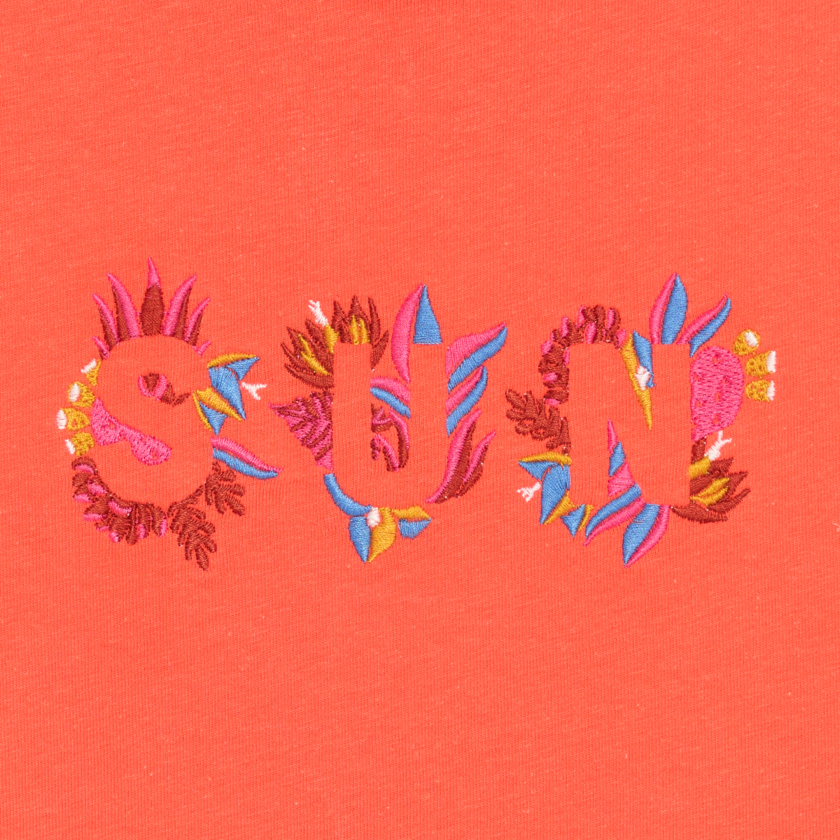 Take a look at that SUN message embroidered on the front: it's a magnificent touch for sunny days! Soft jersey. Straight cut. Crew neck. Short sleeves. Plain back. Straight hemline. Tone-on-tone stitching.