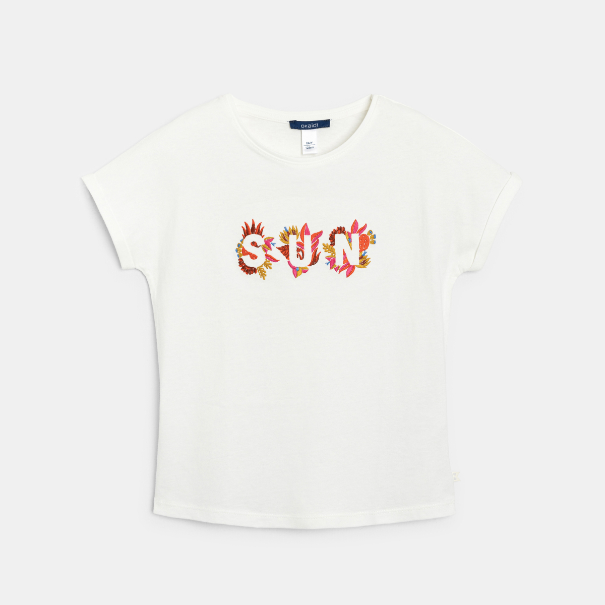 Descriptive Take a look at that SUN message embroidered on the front: it's a magnificent touch for sunny days! Soft jersey. Straight cut. Crew neck. Short sleeves. Plain back. Straight hemline. Tone-on-tone stitching.