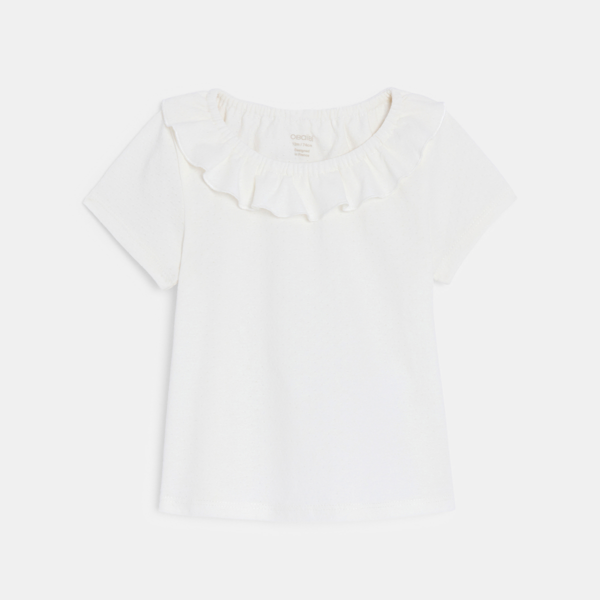 Both elegant and comfortable, this tee with its wide, elasticated ruffled neckline is a romantic style for little girls. Short sleeves and slightly flared hem.