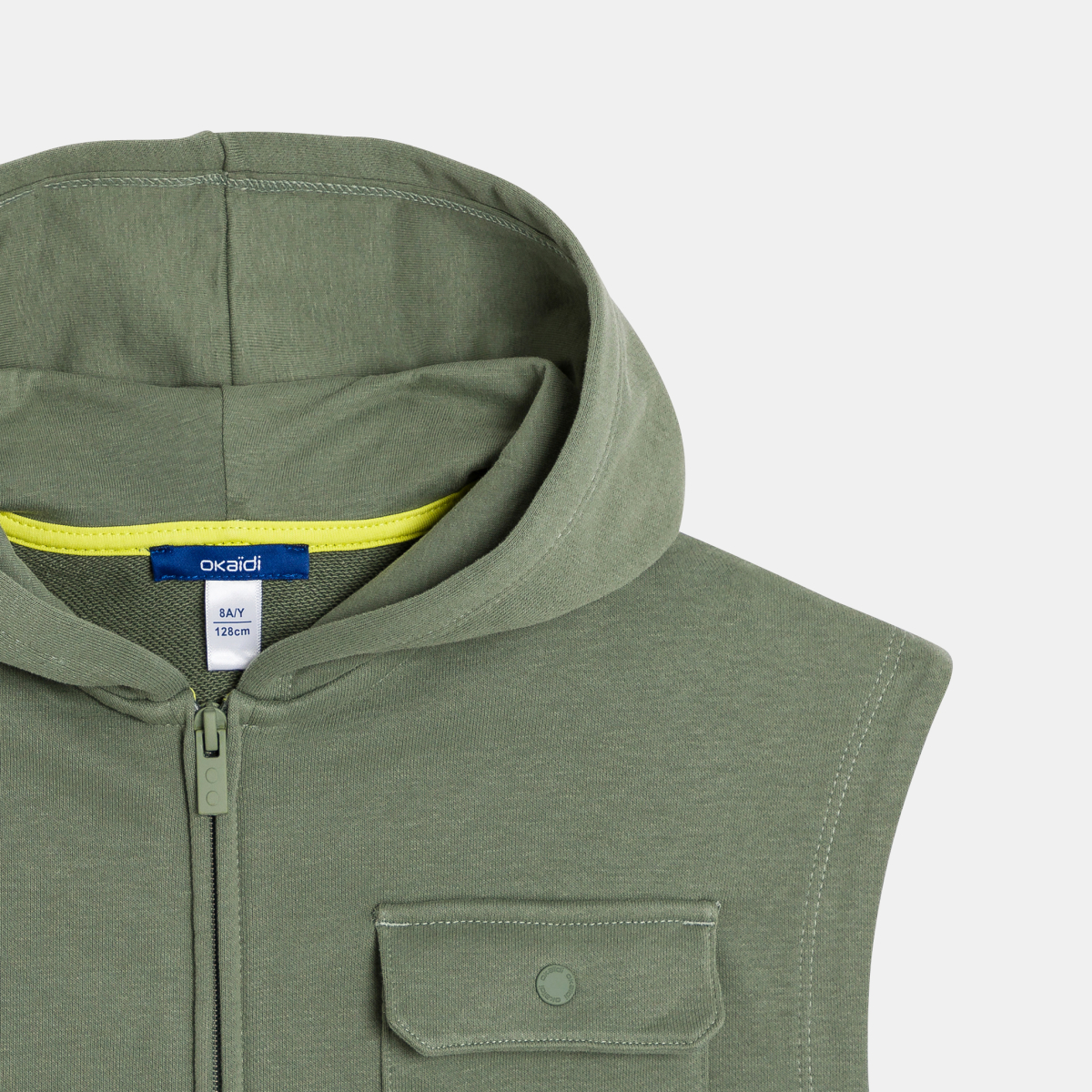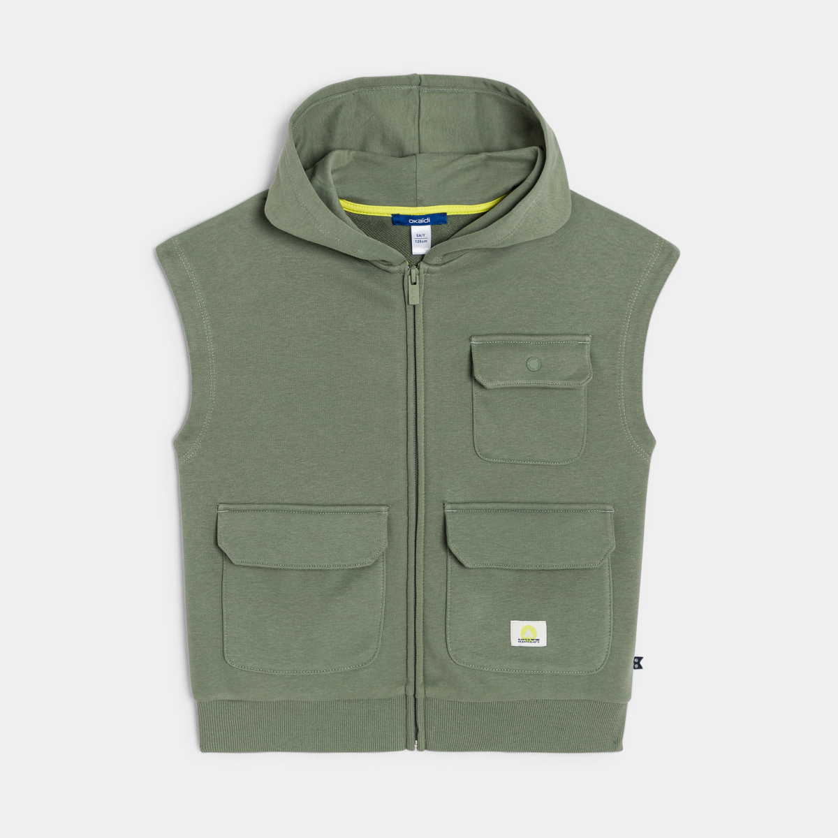 This fleece sweatshirt has lost its sleeves to climb the fashion charts: boys will find it super practical with its 3 front pockets, and easy to coordinate in this khaki version! Cut slightly narrower at the hem. Hood lined in tone-on-tone jersey. Zip fastening. Cut-in armholes. Ribbed edges.