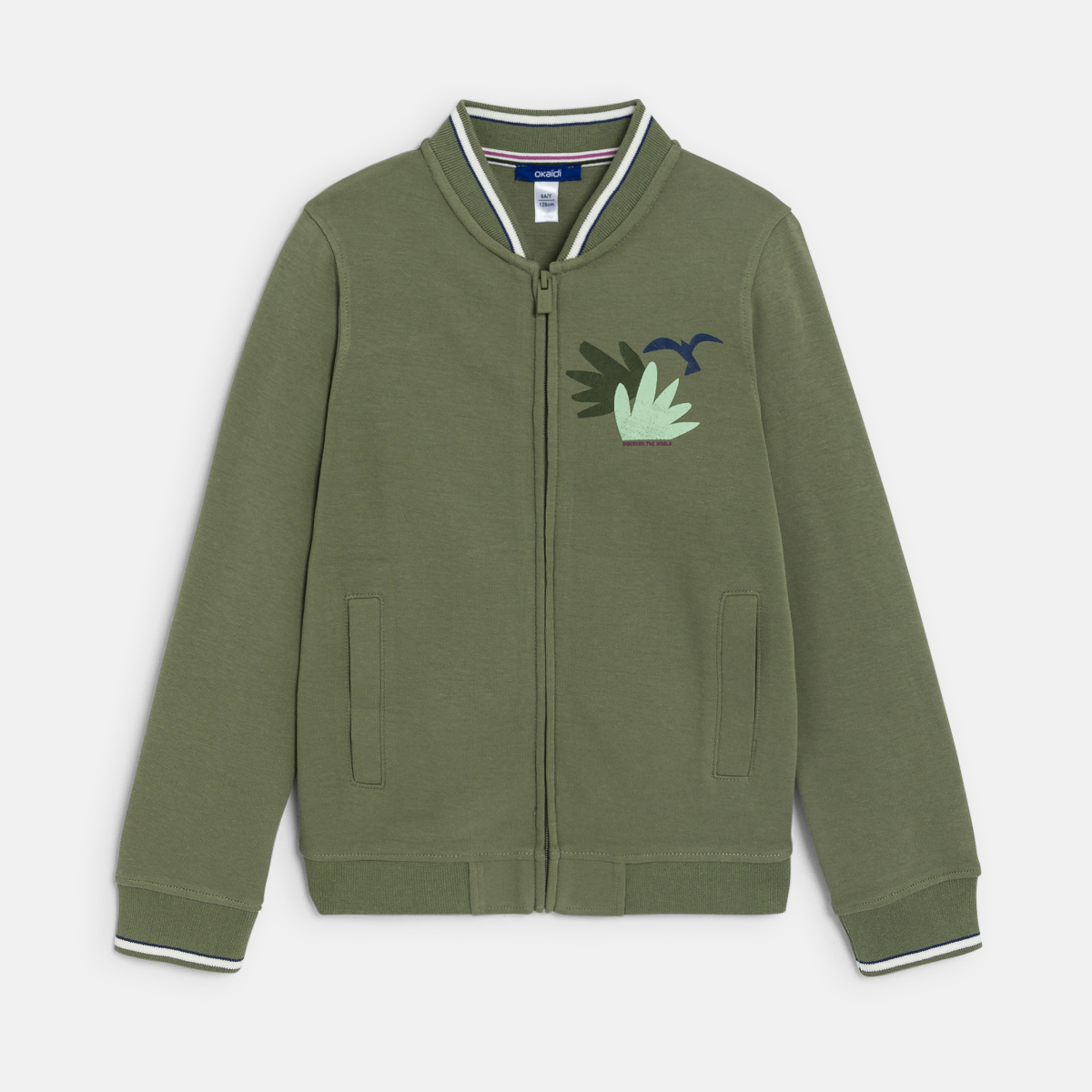 C'est une bonne base dans un vestiaire garçon. Sportswear chic. Facile à coordonner avec un jean, un bermuda, un pantalon chino. Ce sweat copie sur le teddy : col rond et poignets côtelés soulignés d'une fine rayure. Ouverture zippée. Motif imprimé sur la poitrine. Manches longues. 2 poches.