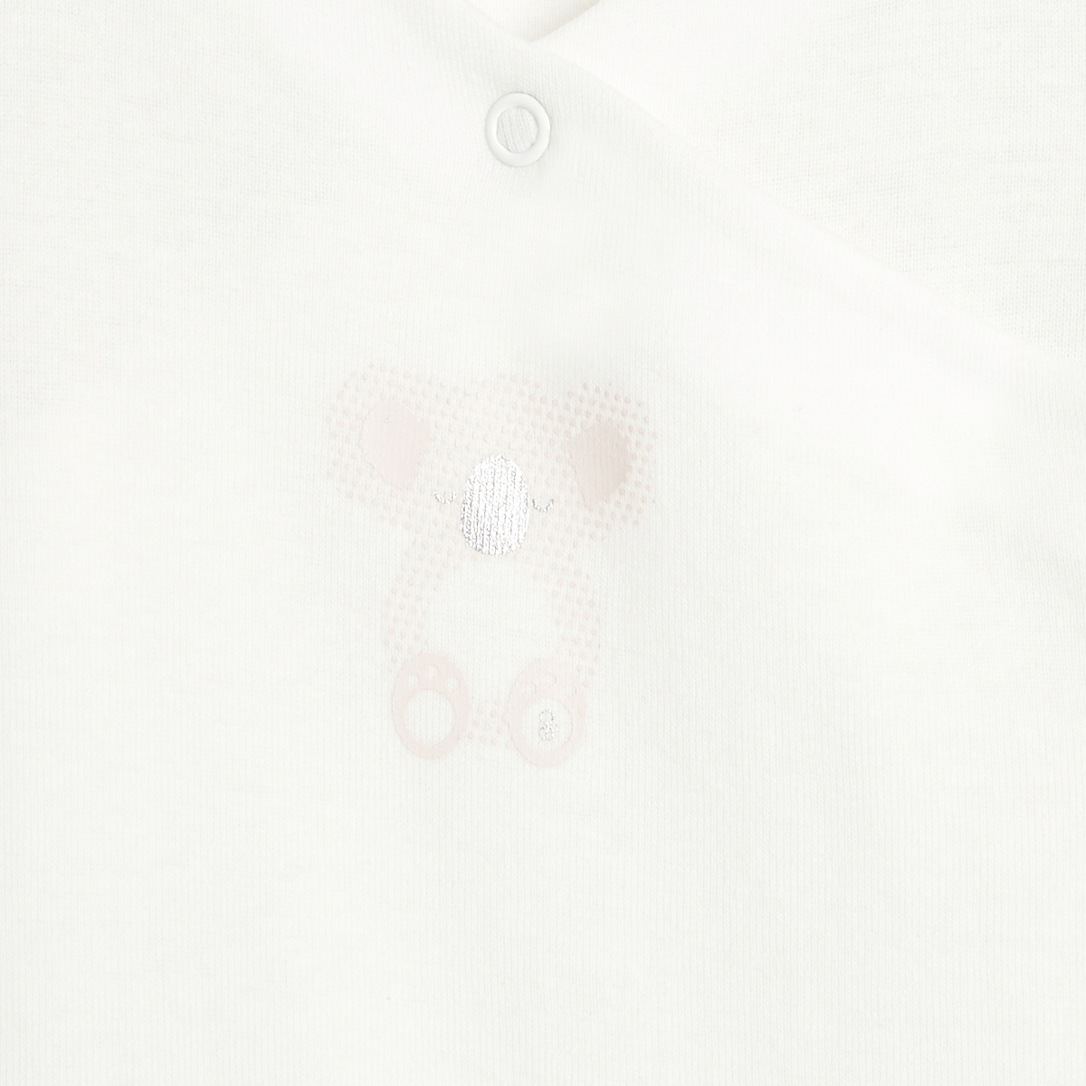 Dès les premiers jours des petites ces bodies manches courtes réchauffent et protègent tout en entourant les filles de douceur. En jersey de coton doux avec ouverture croisée par pressions pour habiller facilement bébé à plat. Deux modèles unis et un rayé avec illustrations d'animaux légèrement irisées.