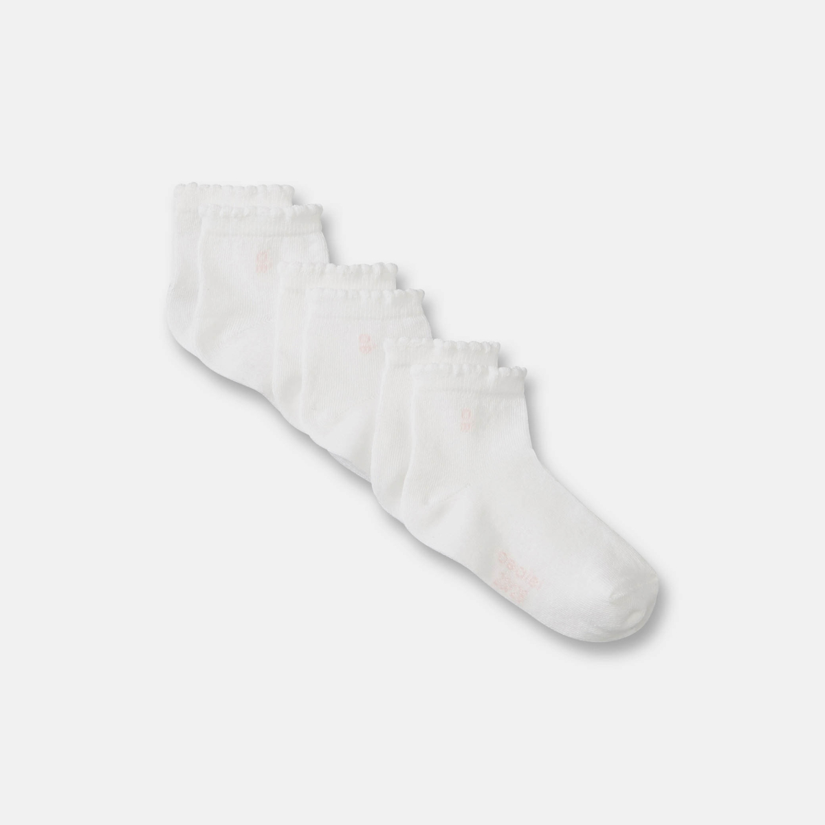 Lot de 3 paires de chaussettes tige basse bébé fille. Trois paires blanches. Maille extensible douce. Haut de tige bord-côtes festonné extensible pour un bon maintien sans comprimer. Logo Obaïbi sur la cheville en jacquard. Taille et Obaïbi sous le pied.