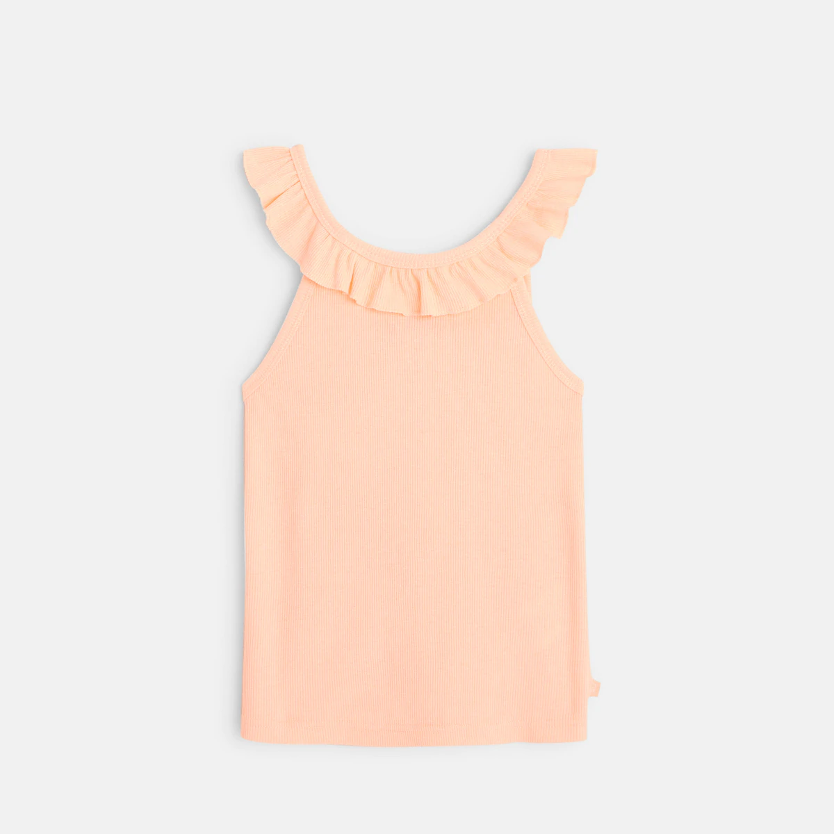Le volant ajoute une touche rétro à ce débardeur basique. Il est doux agréable à porter facile à coordonner : c'est sûr il va faire partie des looks des filles durant toute la belle saison ! Coupe droite. Encolure arrondie dégagée devant et dos. Base droite.