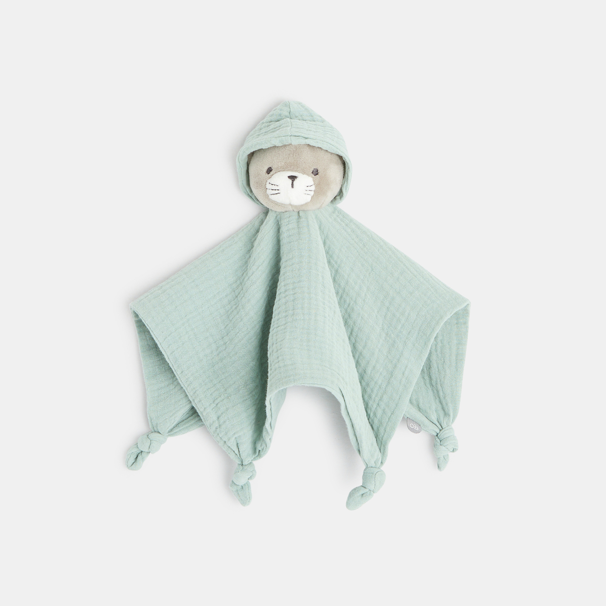 Tout doux le chat se loge sous la capuche et bébé enfouit son nez dans ce doudou en lange de coton. Un doudou plat pratique avec ses noeuds aux extrémités qui facilitent la prise en main par les tout-petits. Tête de chat en velours rembourré finitions brodées sécurisées.