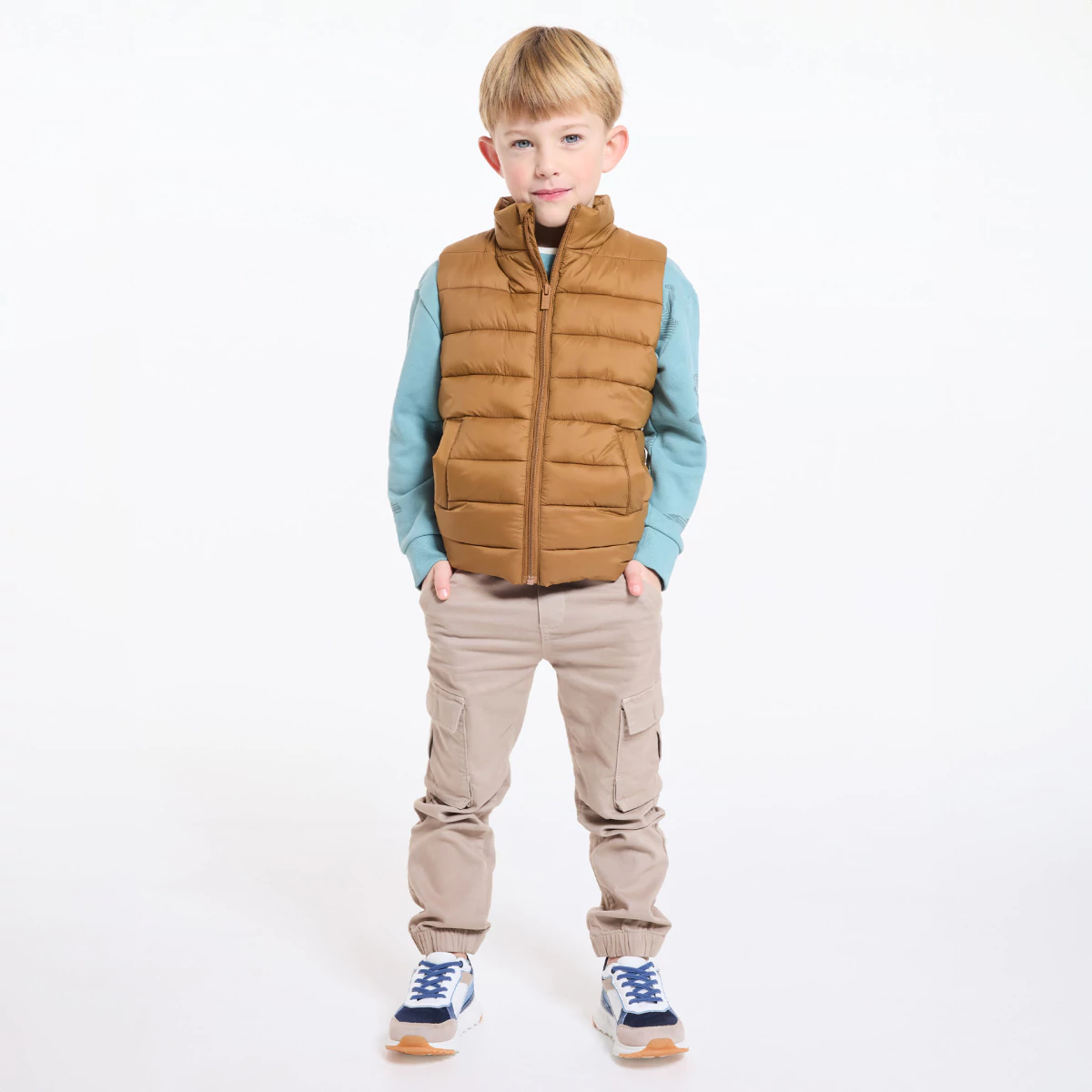 Tendance army tout en douceur : le pantalon cargo en toile est prêt à jouer dehors découvrir le monde se balader en ville... A coordonner avec un sweat ou un t-shirt et des baskets ! Coupe resserrée en bas. Taille élastiquée ajustable avec cordon coulissant à nouer. 6 poches. Bas de jambes élastiqués. Coutures ton sur ton.