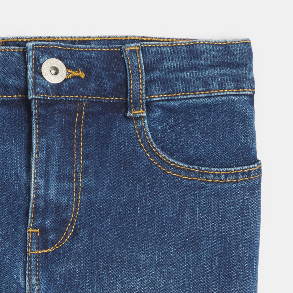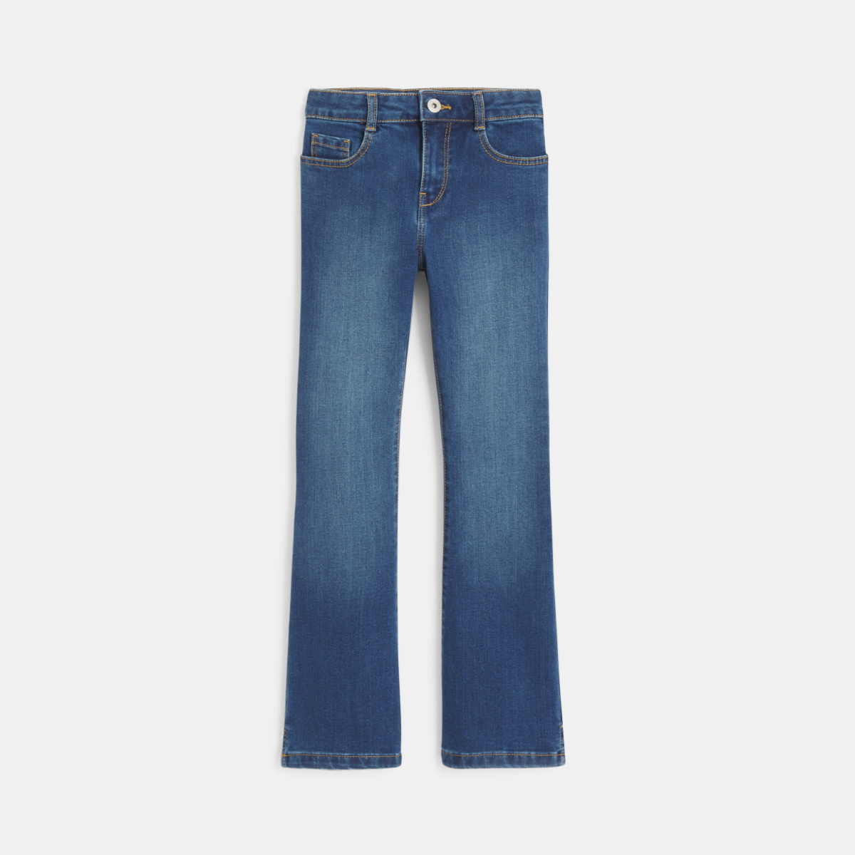 Air seventies et style cool : ce jean évasé en bas se balade partout toute la saison ! Les filles le portent en version chic avec une blouse ou en version cool avec un sweat. Denim doux et légèrement extensible. Passants. Ouverture par bouton clou et zip. Tour de taille ajustable. 5 poches. Coutures contrastées.