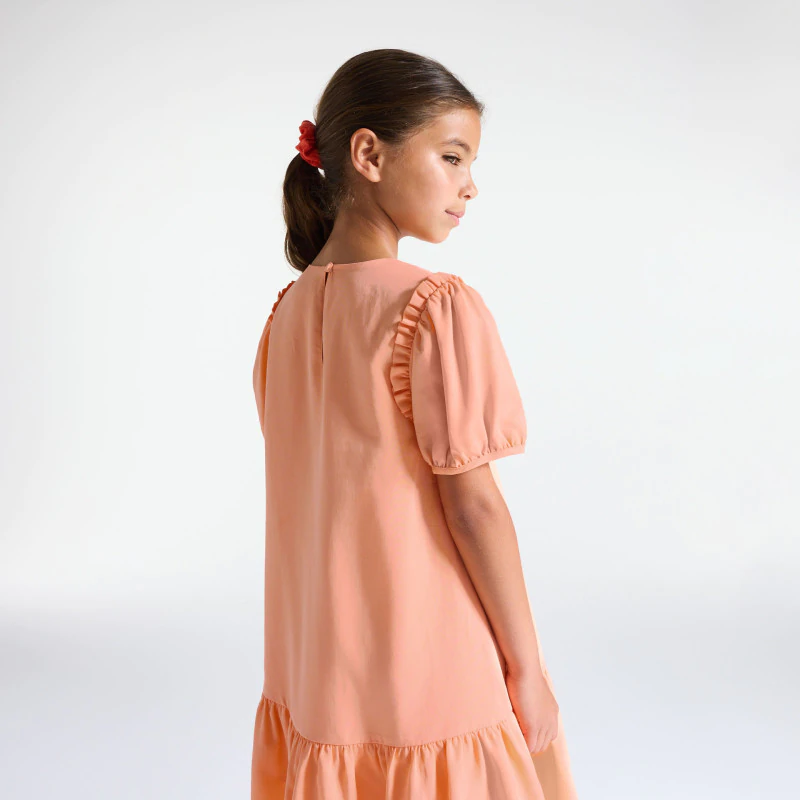 Couleur sorbet et chic annoncé. Cette robe à petits volants a été imaginé pour faire tourbillonner les filles ! Coupe légèrement évasée. Encolure arrondie découpe goutte boutonnée dos enfilage facile. Manches courtes princesse. Base volantée. Coutures ton sur ton.