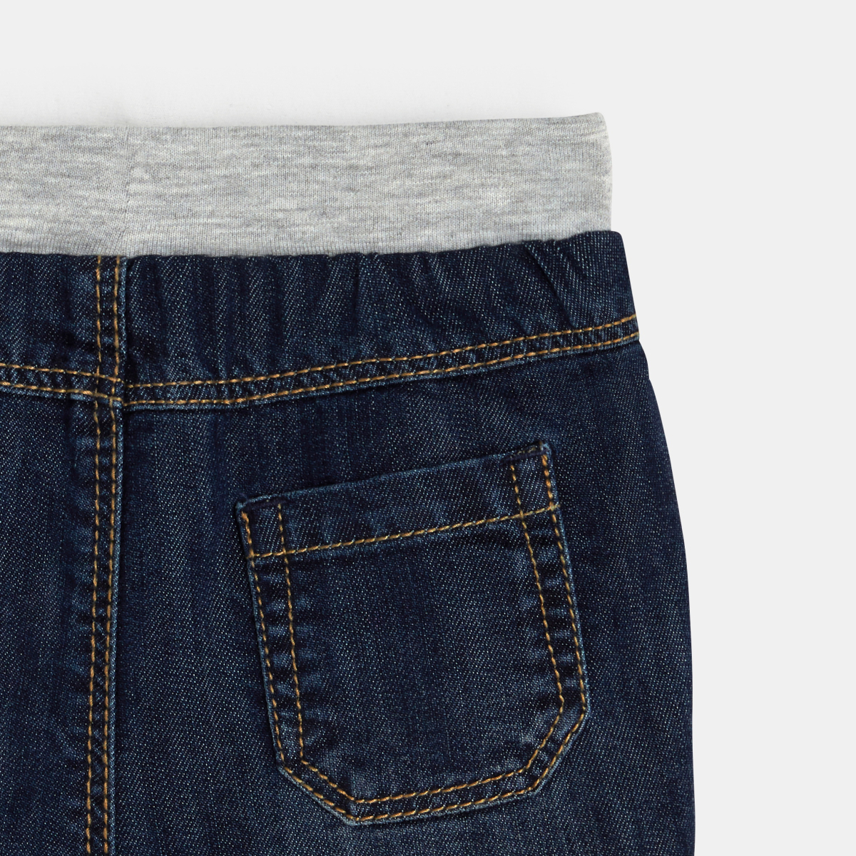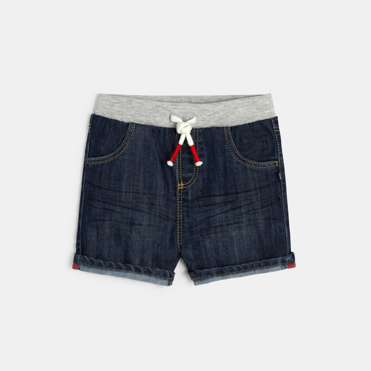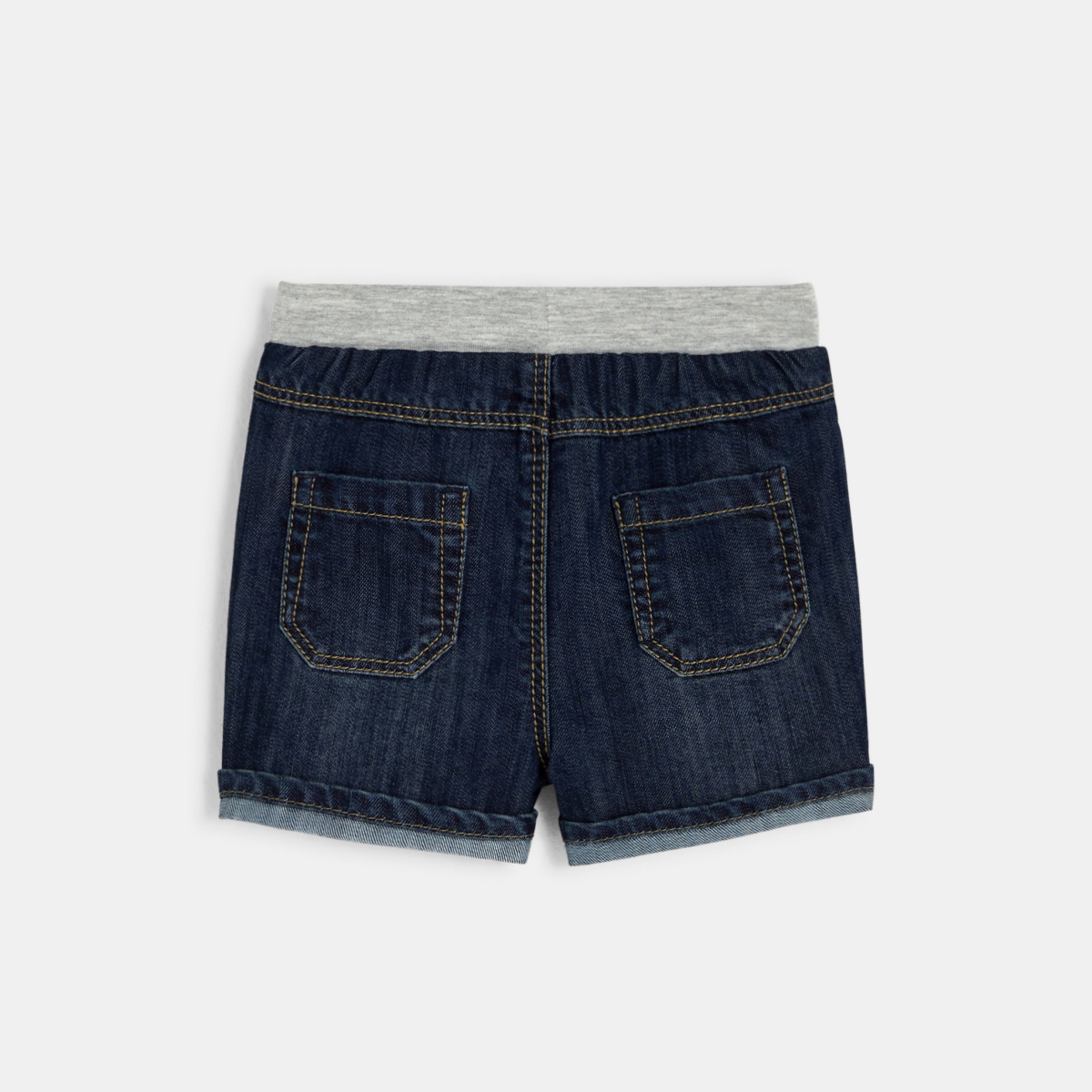 Short en jean bébé garçon. Jean denim enfibres de coton issues de l'agriculture biologique Act for Kids. Forme 4poches. Taille élastiquée sous bord-côtes confortable ajustable par élastiquesintérieurs avec lacet à nouer. Revers libre en bas de jambe. Surpiqûrescontrastantes. Vignette Obaïbi en détail.