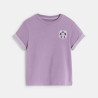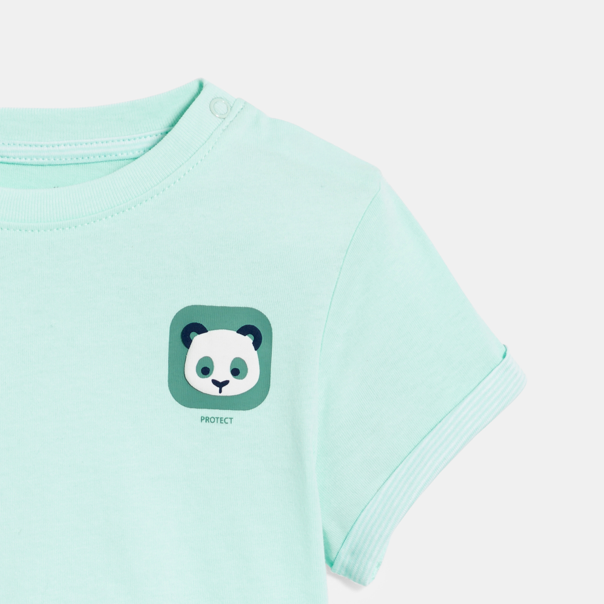 Tee-shirt manches courtes bébé garçon. Maille jersey en fibres de coton issues de lu2019agriculture biologique Act for Kids. Motif en print et gomme sur poitrine différent selon les coloris. Col rond finition bord-côtes pressionné épaule pour faciliter le passage de tête. Manches courtes à revers rayé piqué. Petite vignette Obaïbi en détail.
