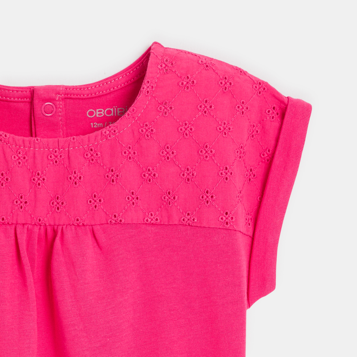 T-shirt bi-matière broderie anglaise rose bébé fille