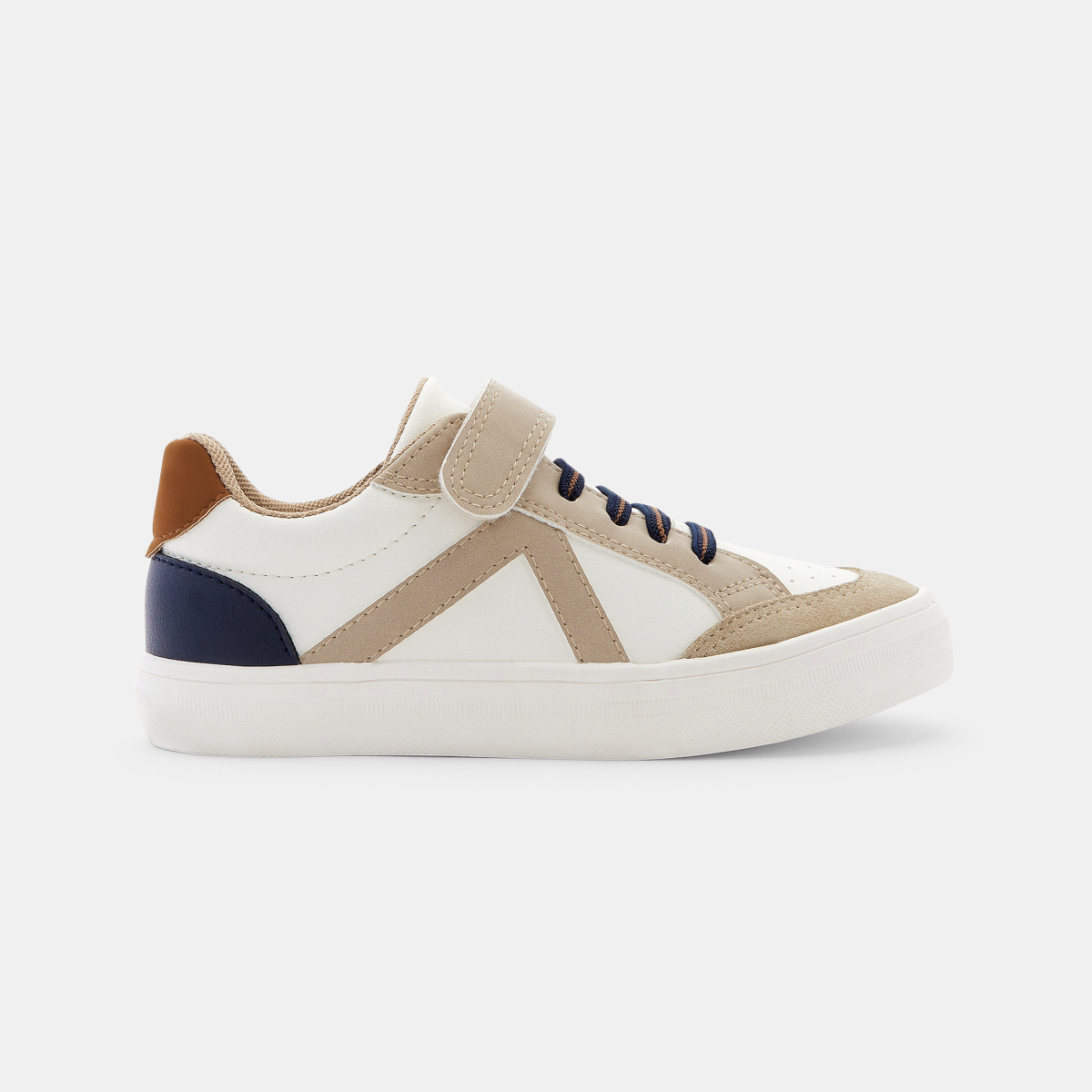 Un jeu de découpes et de matières pour ces baskets basses qui apportent une touche streetwear à une tenue. On aime le renfort en croûte de cuir qui protège les pieds des garçons. Enfilage facile par lacets élastiqués et fermeture par scratch.