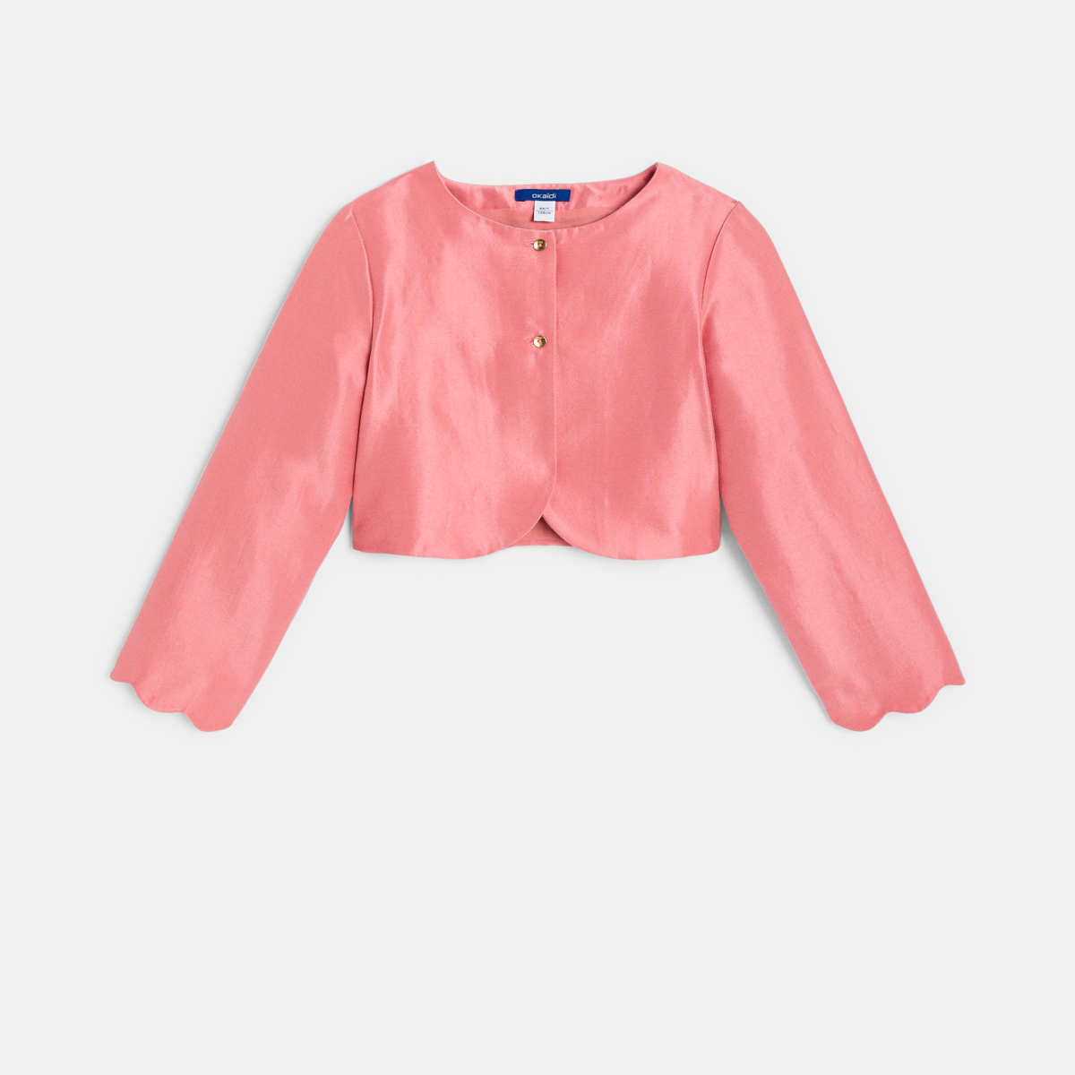 Pièce chic & essentielle, cette veste courte complète à la perfection une robe légère ou un look de fête. La couleur est mise en lumière par un toucher satiné. Deux boutons en métal ferment ce boléro à manches longues. Coupe courte. Manches longues, bord festonné. Base droite.